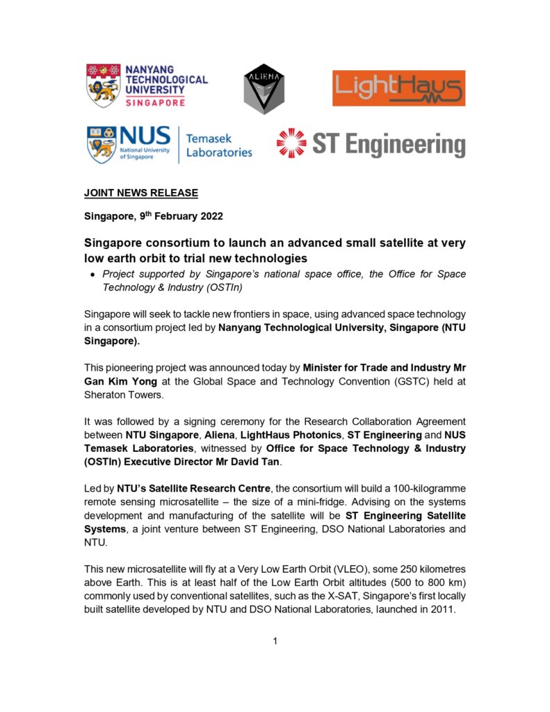 Singapore consortium to launch an advanced small satellite at very low earth orbit to trial new technologies